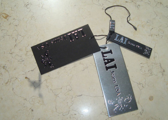 Kami memproduksiLabel Pakaian Kustom Mewah Hang Tag Printing Emboss Black Foil Stamping Logo,